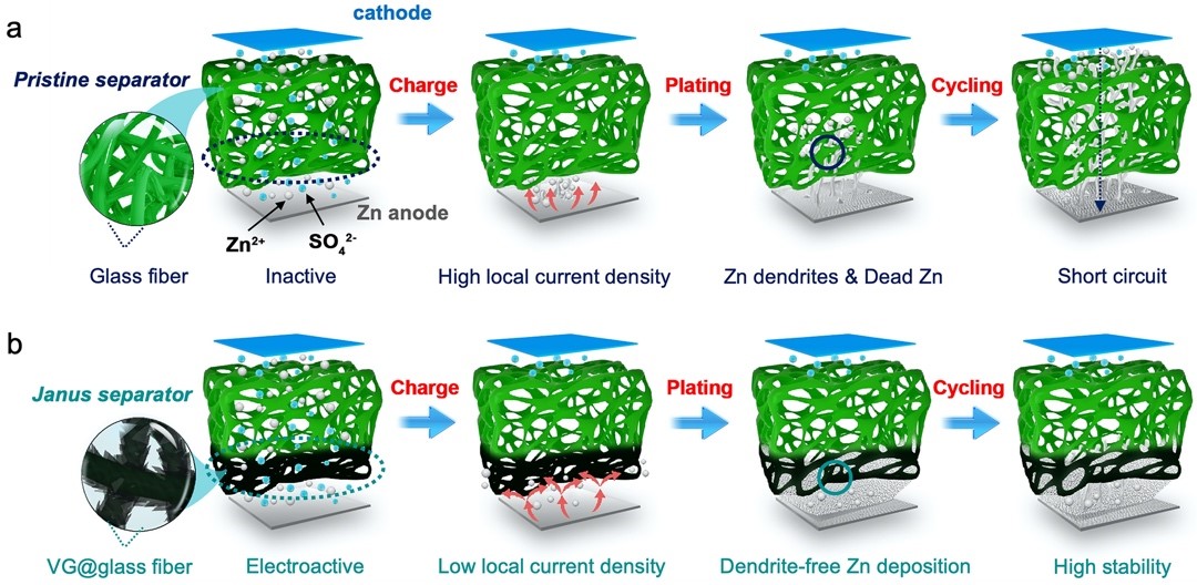 图1:Janus隔膜用于稳定锌金属负极的作用机理