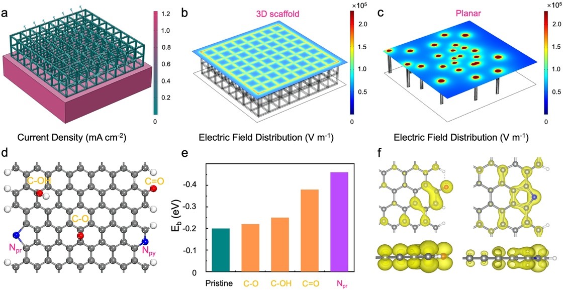 进一步地,通过理论模拟的方法对作用机理进行了分析。首先模拟了平面电极结构与三维导电骨架结构的电流密度与电场分布,结果证明三维导电结构可以明显降低局部电流密度、以及实现更均匀的电场分布。DFT理论计算分析了纯石墨烯以及不同掺杂元素的石墨烯对锌的结合能,结果证明纯石墨烯与锌的结合能较差,结合XPS数据,证明了吡咯氮具有较高的亲锌结合能(图3)。