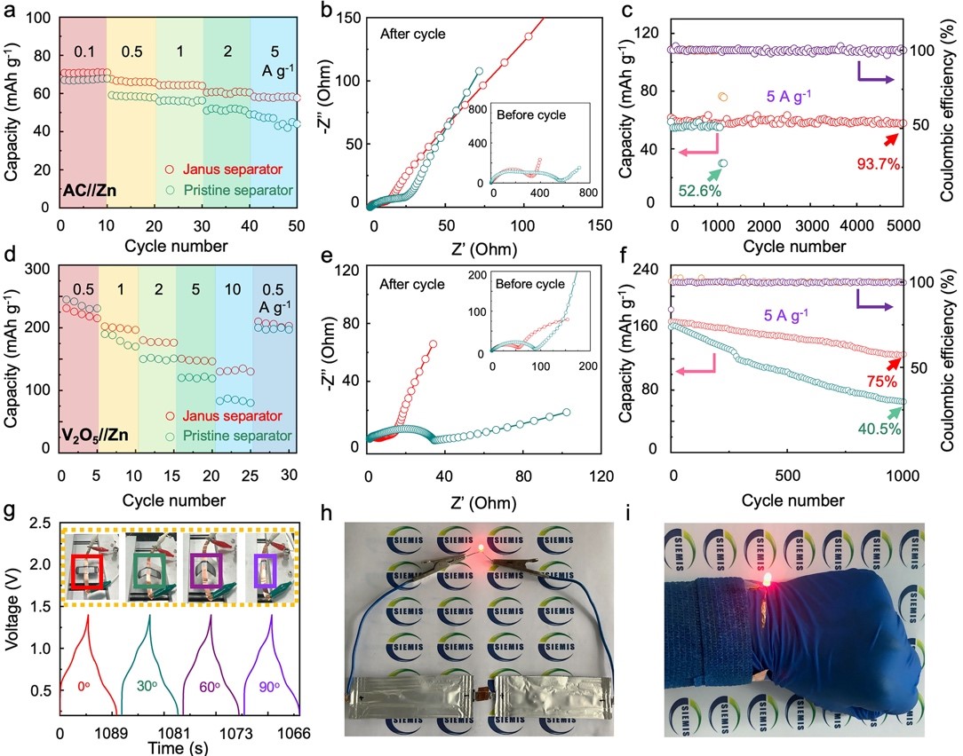 本工作通过直接化学气相沉积技术及plasma处理合成了石墨烯修饰的Janus隔膜,通过对电池非活性组分的结构修饰实现了锌金属负极循环稳定性的提升,进而构建了具有优异电化学性能的柔性水系锌离子电池,为未来高性能、低成本的锌离子电池的应用带来了广阔前景。