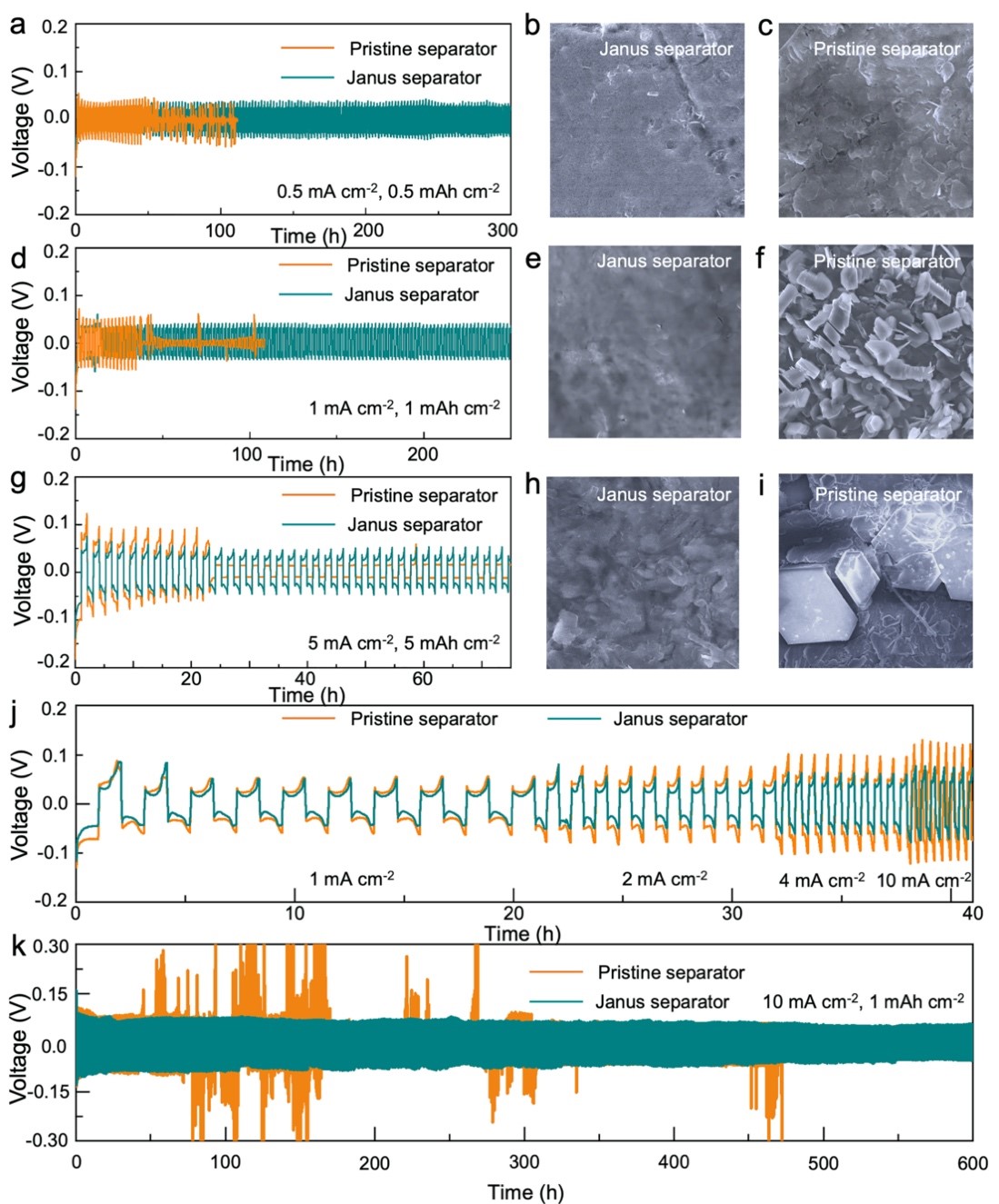 Janus隔膜主要通过PECVD技术和空气plasma处理两步合成,通过SEM、TEM、STEM等常规表征证明了垂直石墨烯的均匀可控生长;对经过plasma处理后隔膜的XPS数据分析证明实现了O、N共掺;Raman光谱的数据证明了O、N掺杂带来更多缺陷态的产生;接触角的测试证明plasma处理改善了隔膜对电解液的浸润性,同时具有较高的离子电导率。通过Zn|Zn对称电池的测试对比了两种隔膜对电化学性能的影响,在不同的电流密度和面容量的锌沉积/剥离测试中,与原始的玻璃纤维隔膜相比,Janus隔膜具有更好的循环稳定性,循环50 h后的锌箔具有更平整的表面(图2)。