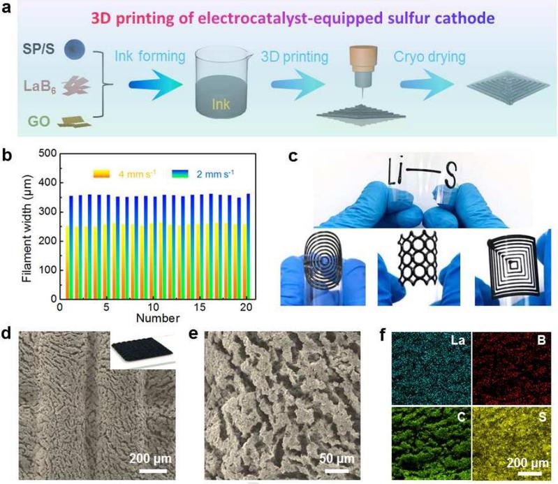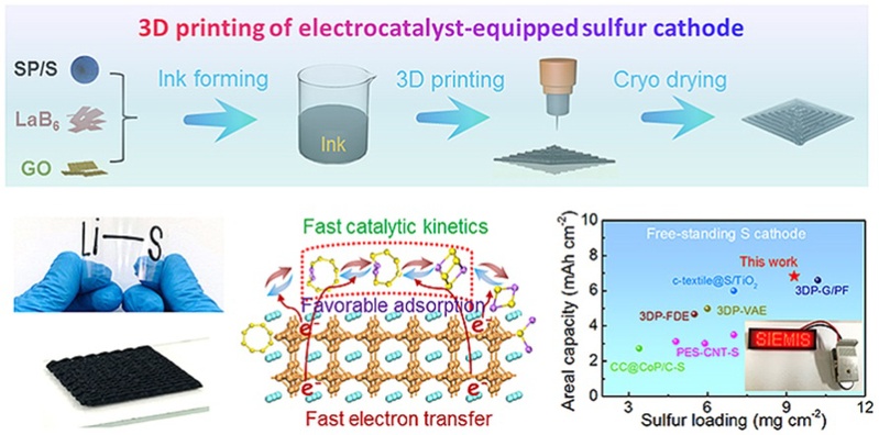 在这项工作中,作者展示了基于3D打印技术对3DP-LaB6/SP@S自支撑高性能硫正极的构造。该打印的正极具有充足的、开放的多级孔道,这将确保电子/离子畅通的传输路径,并在长期循环中缓冲体积膨胀。值得注意的是,金属LaB6电催化剂可以均匀地分布在3D打印的架构内,自发地确保有足够的活性位点用于LiPS固定和转化,以实现高速率的放电/充电。此3D打印的硫正极可提供693 mAh g-1的初始容量,并在6.0 C的电流密度下800周循环内获得高循环稳定性,每周容量衰减低至0.067%。更重要的是,即使在硫载量为9.3 mg cm-2的情况下,仍可以保持7.98 mAh cm-2的高面积容量,优于近期报道的3D打印Li–S系统。结果证明了3D打印策略有望对高性能Li–S电池进行合理设计,并且可以推广到其他新兴的储能设备。