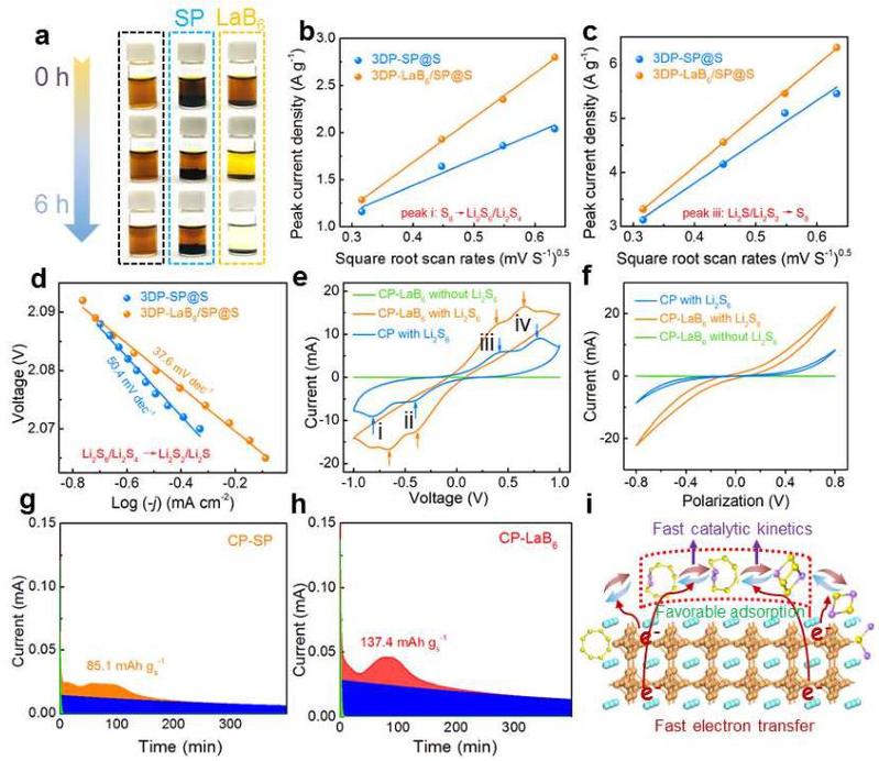 为了抑制LiPS穿梭并提高Li-S化学中的硫动力学,极性材料(如金属氧化物/硫化物/氮化物)以及非极性碳质材料已经被广泛用作宿主或添加剂。其中,具有高电导率的金属化合物对LiPS的转化具有良好的电催化活性。近年来,金属硼化物(例如,MgB2,TiB2)对构建高性能Li-S电池已引起领域浓厚兴趣。具有类似性质的金属性六硼化镧(LaB6)作为一种低成本且可持续的化合物,已在许多领域得到广泛使用。然而,在Li-S电池领域几乎没有被报道过。